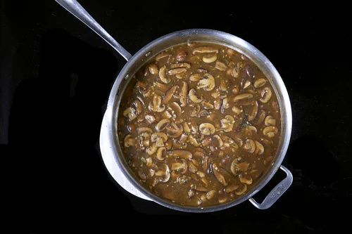 2) In a small bowl, whisk together stock, miso and arrowroot until no lumps remain. Turn the heat under the mushrooms back up to medium and pour the stock mixture into the pan and bring to a simmer; cook until the gravy thickens.
